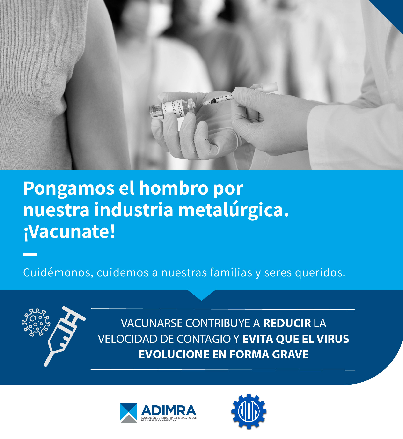 En conjunto con la UOMRA, desde ADIMRA lanzamos una campaña para promover la vacunación tanto de los trabajadores metalúrgicos como de sus allegados.