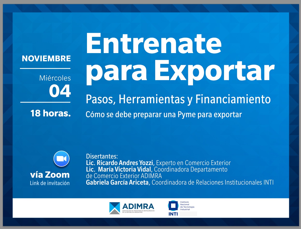 Desde ADIMRA en conjunto con el INTI diseñamos una serie de charlas virtuales destinadas a Pymes vinculadas al comercio exterior. Tanto para aquellas pymes que deseen insertarse en el mercado internacional y obtener herramientas para poder vender sus productos en el exterior, como para aquellas que ya lo vienen haciendo.